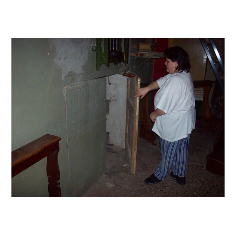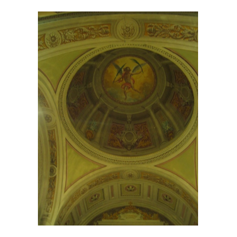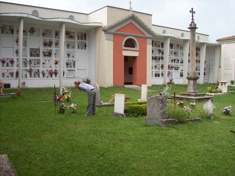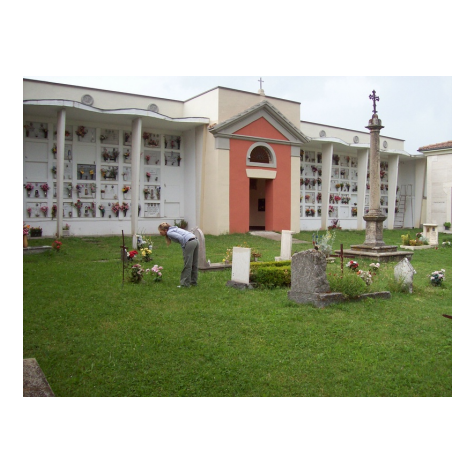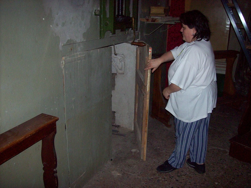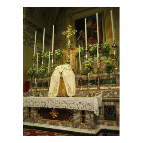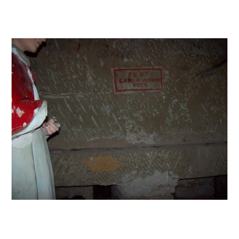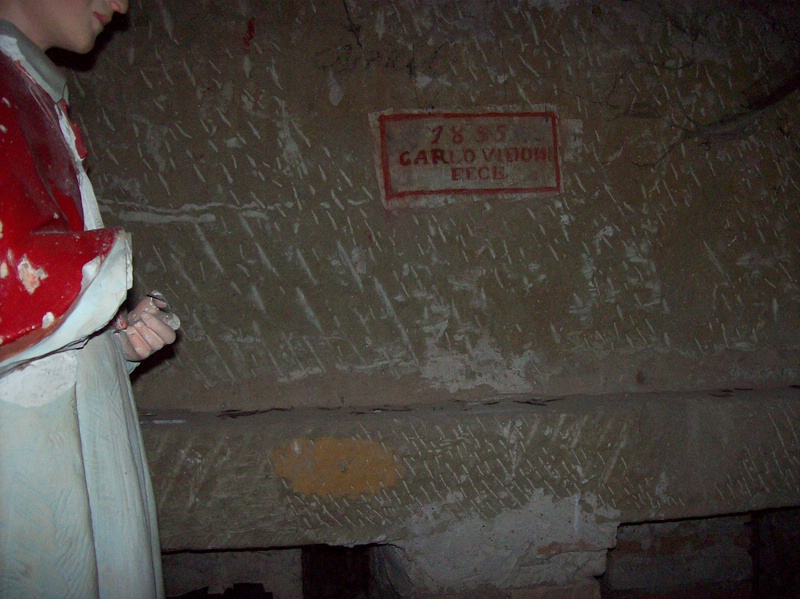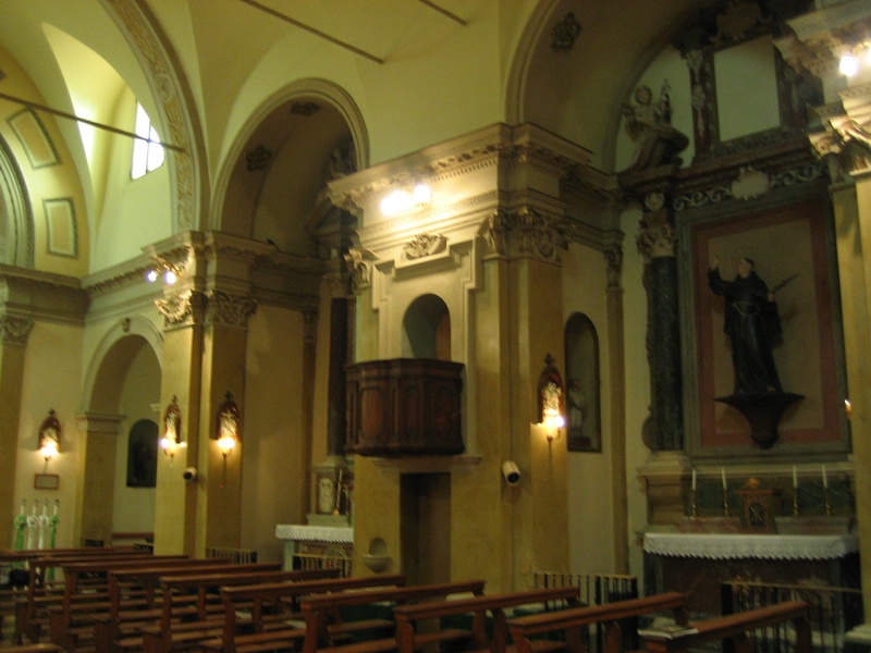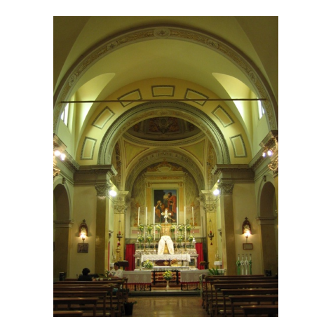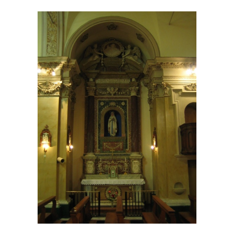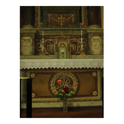 Purtroppo la chiesa è chiusa, ma vediamo un uomo che esce da una porta secondaria al quale ci rivolgiamo per sapere se è a conoscenza della tomba di Mattei all'interno della Chiesa. Non ne sa nulla, ma ci accompagna in uno stanzino attiguo alla chiesa dove incontriamo 2 signore, una delle quali ci apre le porte della chiesa e ci accompagna in una piccola visita guidata...che fortuna! Davanti a noi l'arca, l'altare sotto al quale è scritto venne sepolto Giacomo Mattei. Chiediamo allora se la tomba sia proprio li, e la signora gentilissima ci apre una porticina dietro all'altare che non veniva aperta da anni, che porta ad una vecchia cripta che però ci viene detto è stata murata nel dopoguerra. L'emozione è grande, ma purtroppo la nuova muratura rende inaccessibile la cripta, davvero un gran peccato! Prima di uscire ci soffermiamo davanti ad un piccolo altare dedicato alla Madonna dove troviamo, dietro a delle rose, lo stemma sacro che anche in Rocchetta campeggiava nel rosone della sala dei 90 (ora ripristinato col ritratto di Cesare Mattei come era in origine). Ci spostiamo anche nell'attiguo cimitero per scovare qualche eventuale membro della famiglia Mattei, ma tutte le tombe, anche quelle che sembrao molto vecchie, non lo sono abbastanza.